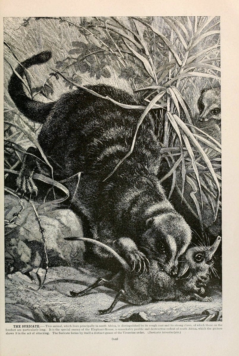 Brehm's Life of animals : Volume 1, MammaliaChicago :Marquis,1895.|"Animal behavior" Mammals "American Museum of Natural History Library" |suricate | taxonomy:binomial=Suricata suricatta | Meerkat | Elephant Shrew |