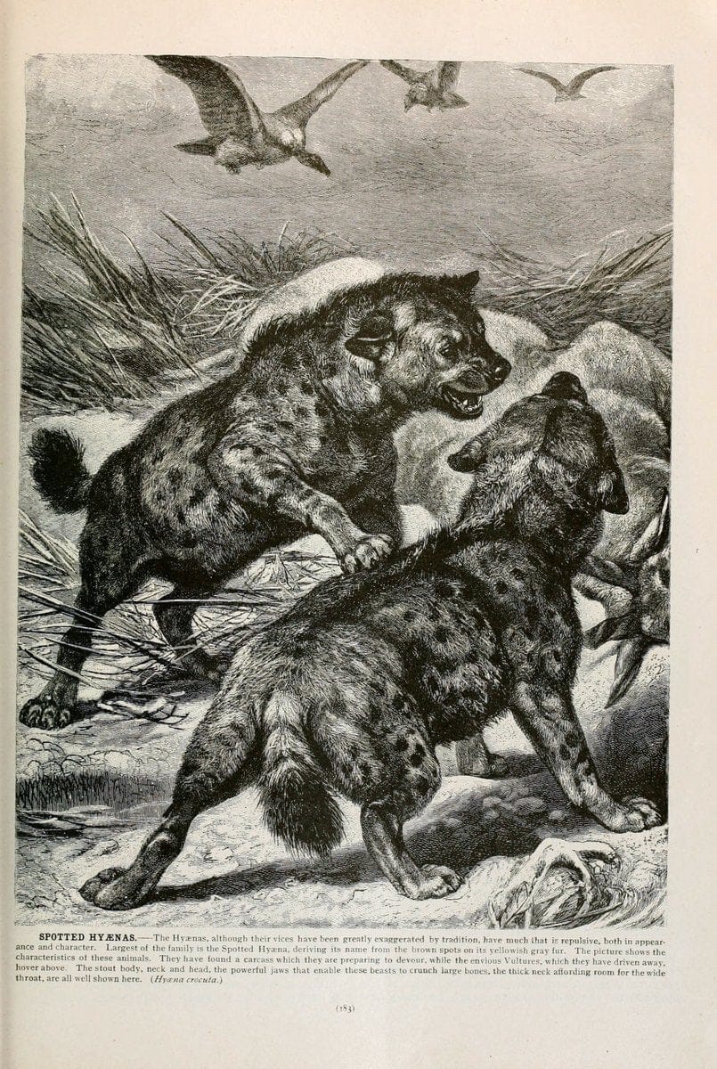 Brehm's Life of animals : Volume 1, MammaliaChicago :Marquis,1895.|"Animal behavior" Mammals "American Museum of Natural History Library" |hyena | taxonomy:binomial=Crocuta crocuta | Spotted Hyena |
