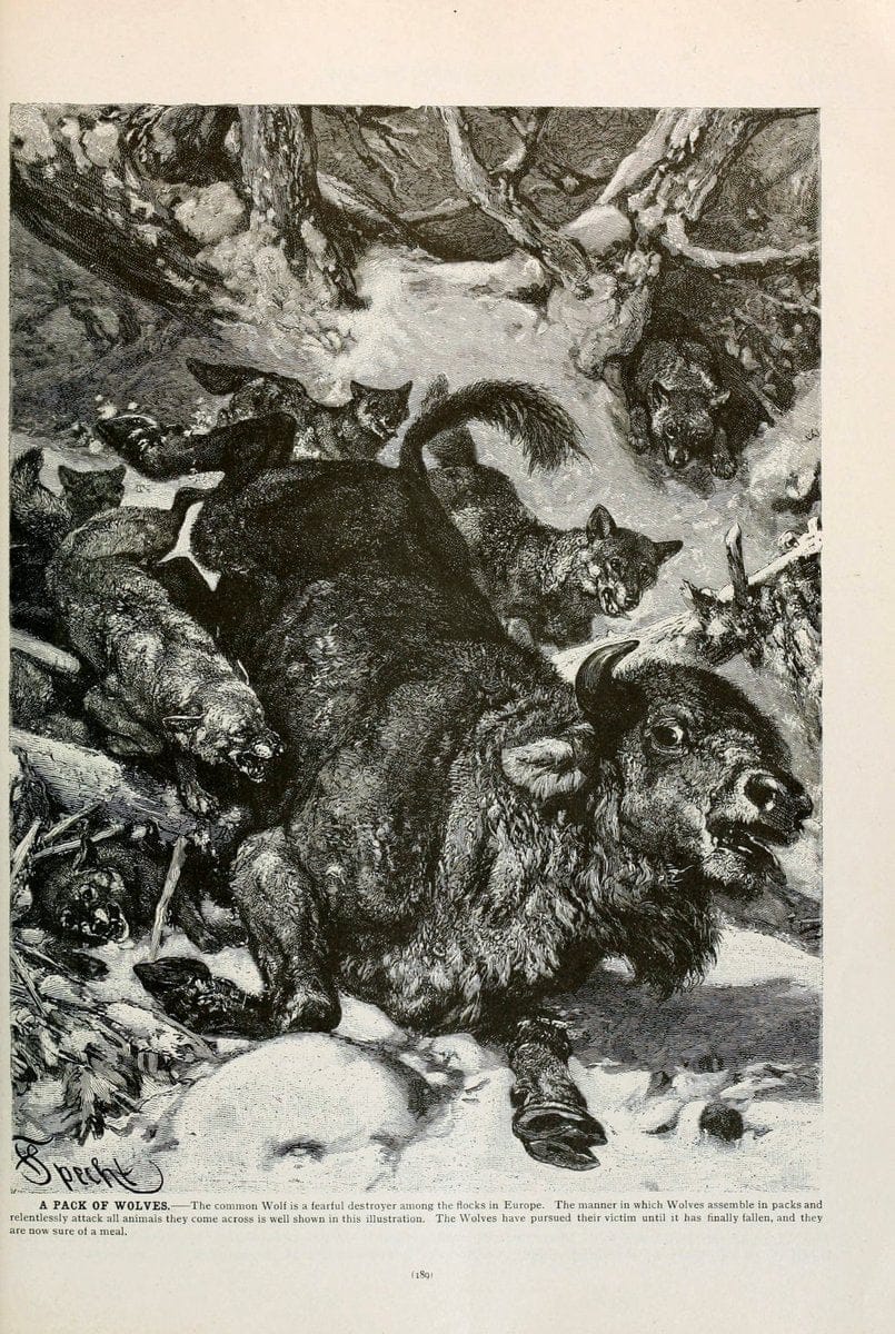 Brehm's Life of animals : Volume 1, MammaliaChicago :Marquis,1895.|"Animal behavior" Mammals "American Museum of Natural History Library" |wolf | Grey Wolf | taxonomy:binomial=Canis lupus familiaris | Wisent | European Bison | taxonomy:binomial=Bison bonasus |
