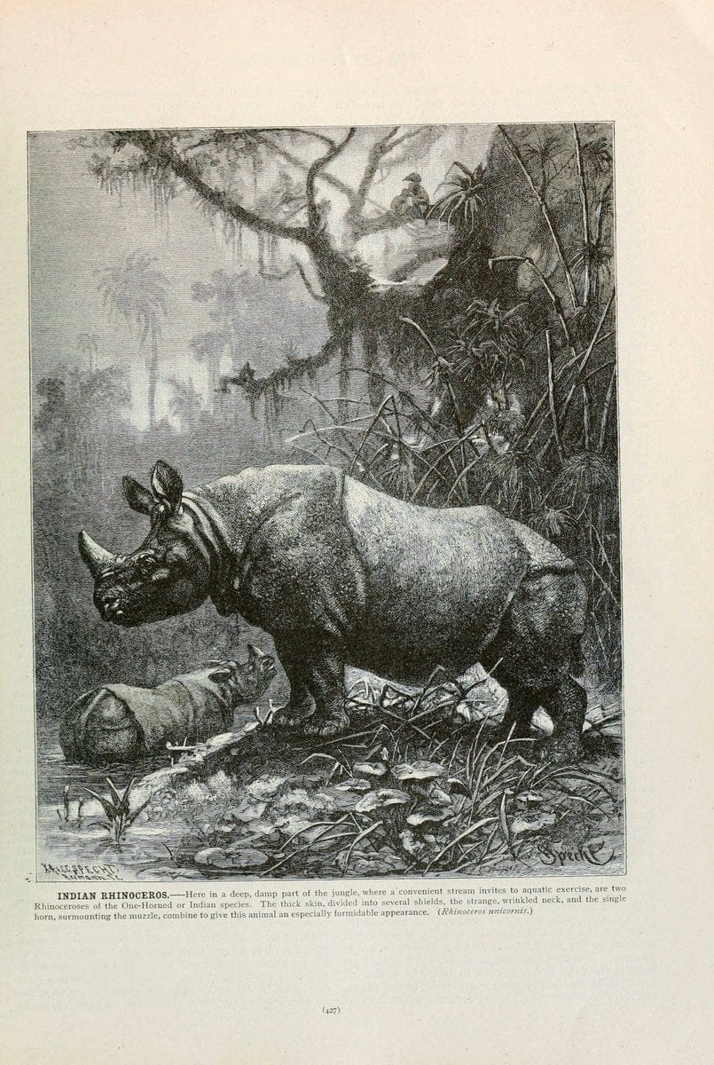 Brehm's Life of animals : Volume 1, MammaliaChicago :Marquis,1895.|"Animal behavior" Mammals "American Museum of Natural History Library" |rhino rhinoceros | taxonomy:binomial=Rhinoceros unicornis | Indian Rhinoceros |