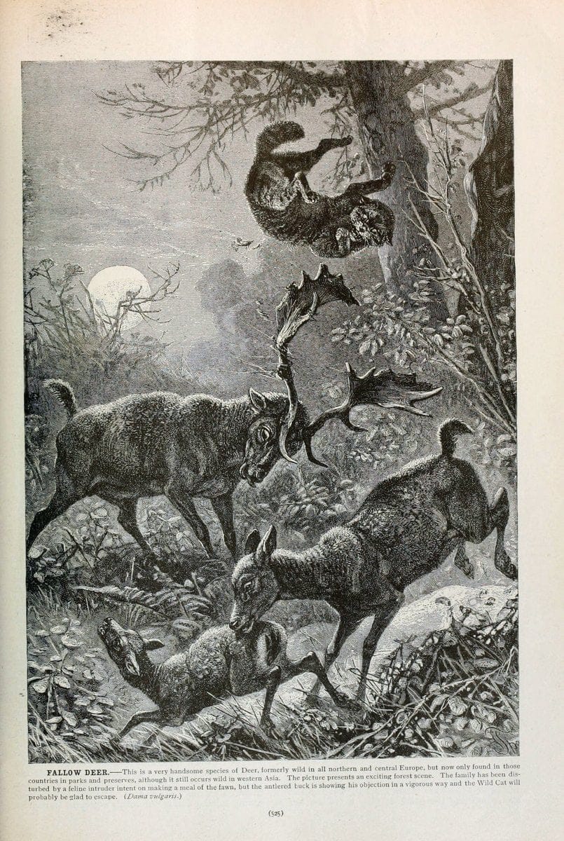 Brehm's Life of animals : Volume 1, MammaliaChicago :Marquis,1895.|"Animal behavior" Mammals "American Museum of Natural History Library" |deer | Fallow Deer | taxonomy:binomial=Dama dama | taxonomy:binomial=Felis silvestris | Wildcat