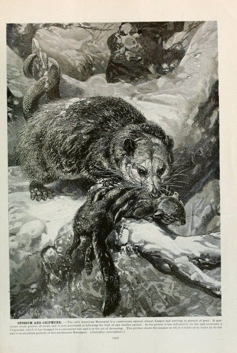 Brehm's Life of animals : Volume 1, MammaliaChicago :Marquis,1895.|"Animal behavior" Mammals "American Museum of Natural History Library" |opossum chipmunk | taxonomy:binomial=Didelphis virginiana | Virginia Opossum | Common Opossum | Eastern Chipmunk | taxonomy:binomial=Tamias striatus |