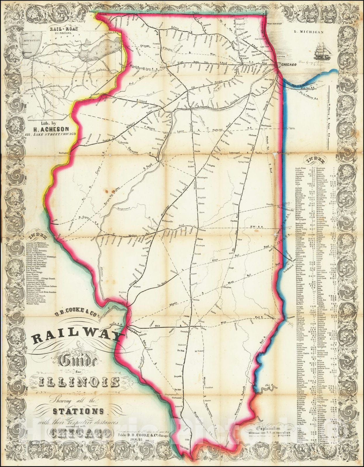 Historic Map : D.B. Cooke & Co.s' Railway Guide for Illinois Shewing all the Stations with their Respective distances connecting with Chicago, Jan: '55, 1855, Vintage Wall Art