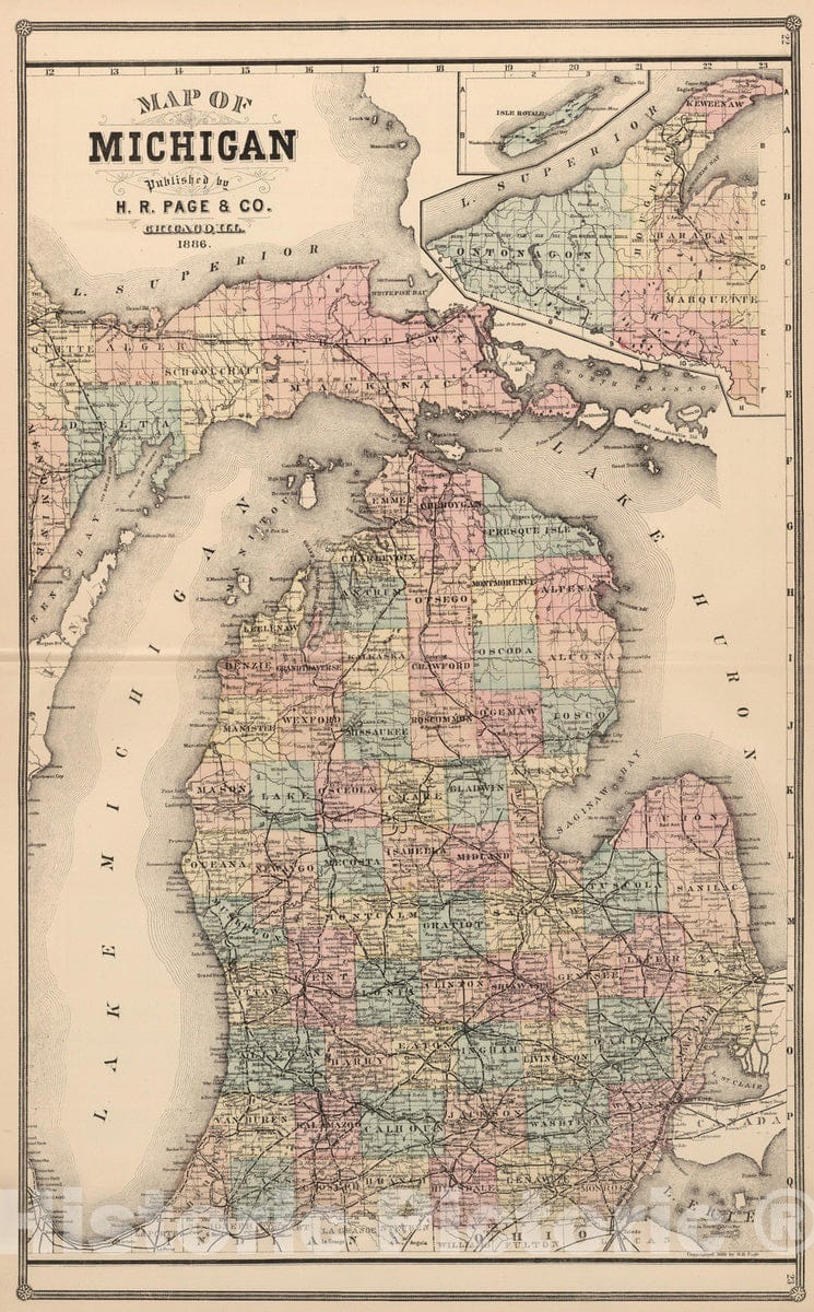 Historic Map : 1886 Michigan, Published by H.R. Page & Co, Chicago, Ill. 1886. - Vintage Wall Art