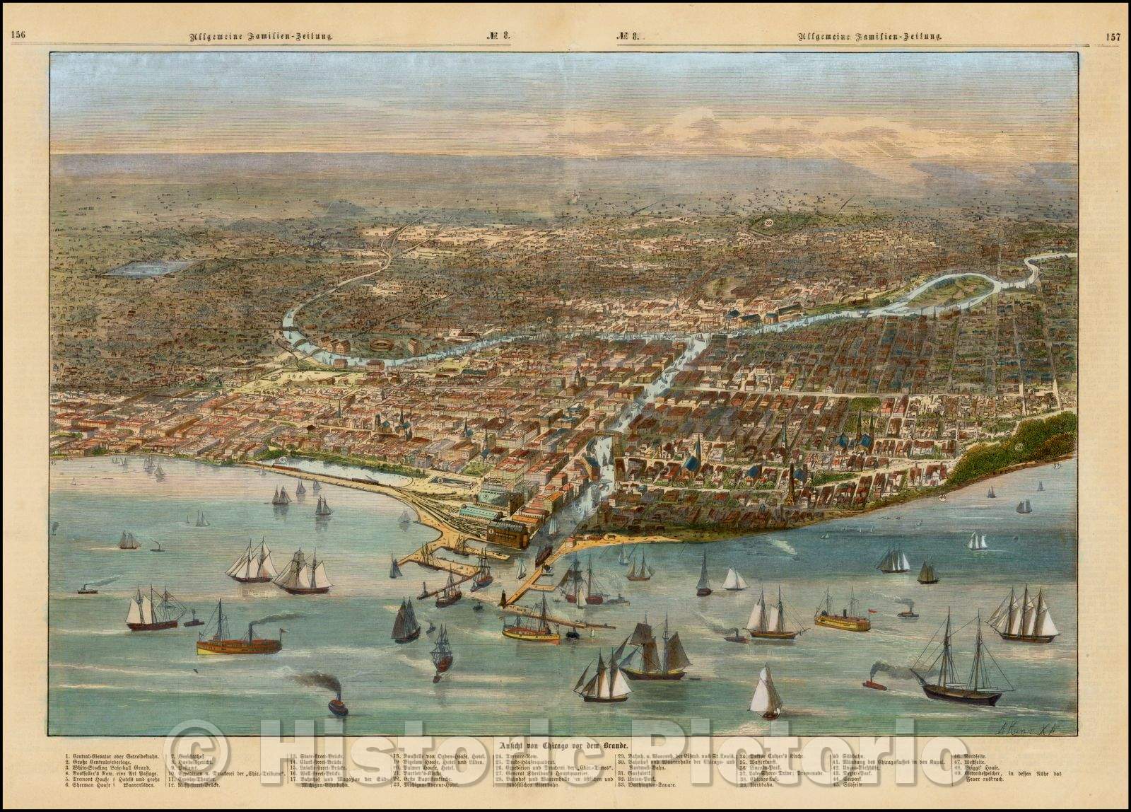 Historic Map - Ansicht von Chicago vor dem Brande/View of Chicago, with Lake Michigan in the foreground, from a German publication, 1872 - Vintage Wall Art