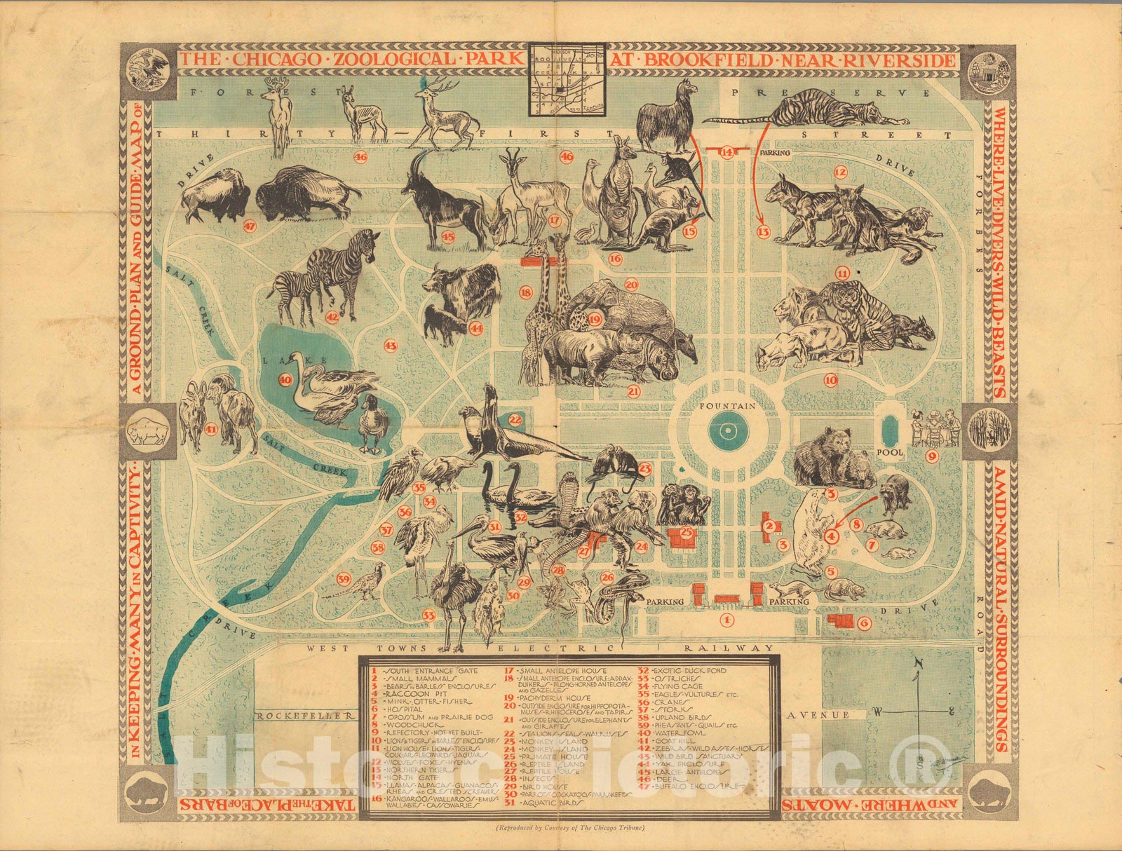 A Ground Plan and Guide Map of the Chicago Zoological Park at Brookfield near Riverside Where Live Divers Wild Beasts Amid Natural Surroundings and Where Moats Take the Place of Bars in Keeping Many in Captivity. Reproduced by courtesy of the Chicago Tribune. (inset: Location map). | A Ground Plan and Guide Map of the Chicago Zoological Park at Brookfield near Riverside Where Live Divers Wild Beasts Amid Natural Surroundings and Where Moats Take the Place of Bars in Keeping Many in Captivity. Reproduced by courtesy of the Chicago Tribune. (inset: Location map). |