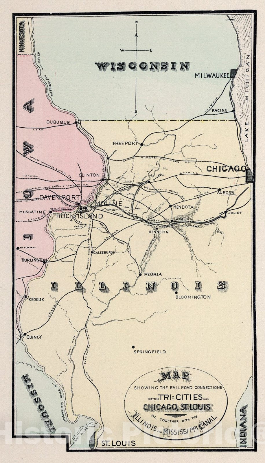 Historic Map : Railroad Connections of the Tri-Cities (Davenport, Moline, Rock Island) with Chicago, St. Louis., 1894, Vintage Wall Art