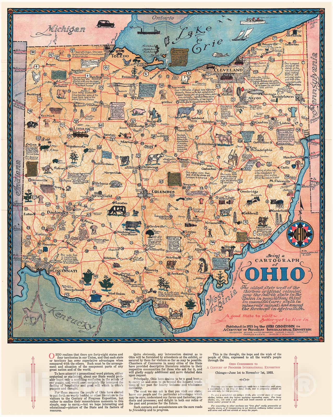 • Historic Map : Sewah Studios Pictorial Map of Ohio (The Chicago World's Fair), 1933, Vintage Wall Art