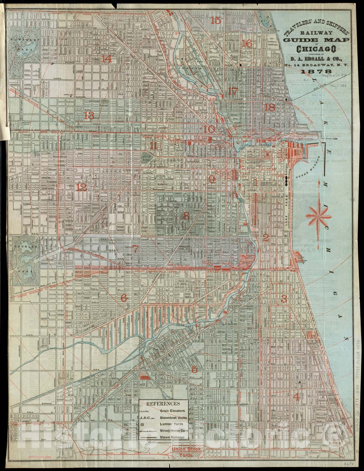 • .Historical Map, 1878 Travelers' and shippers' Railway Guide map of Chicago, Vintage Wall Art