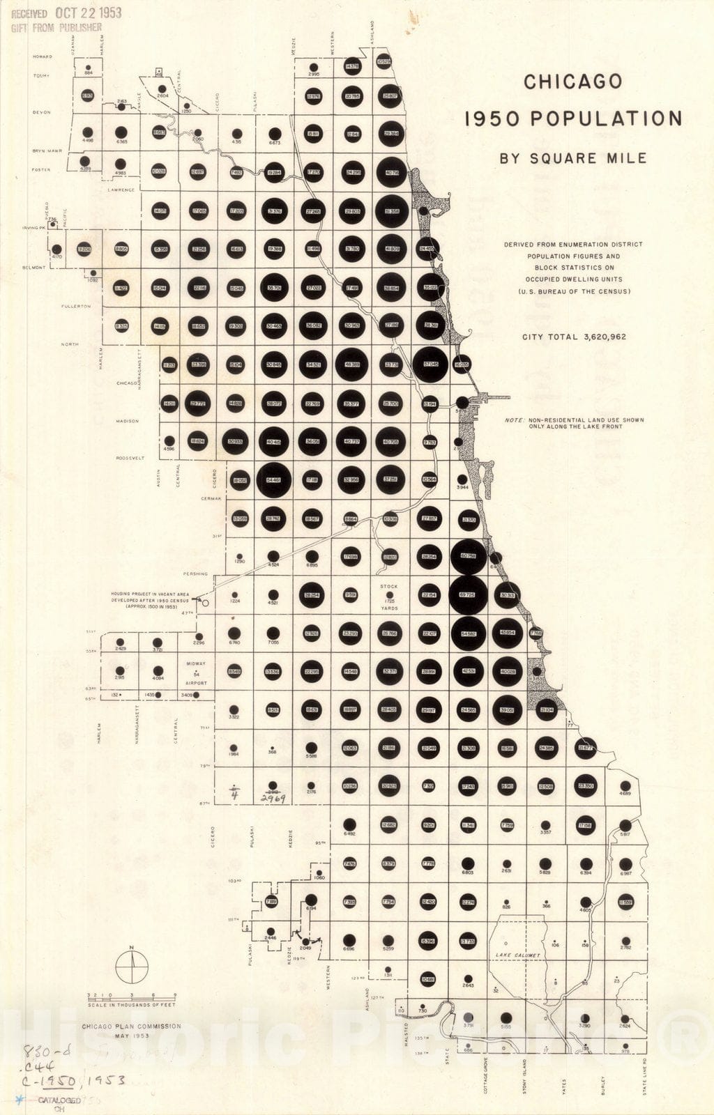 • Map : Chicago, Illinois 1953, Chicago Population by square mile : 1950 and 1940-50 change , Antique Vintage Reproduction