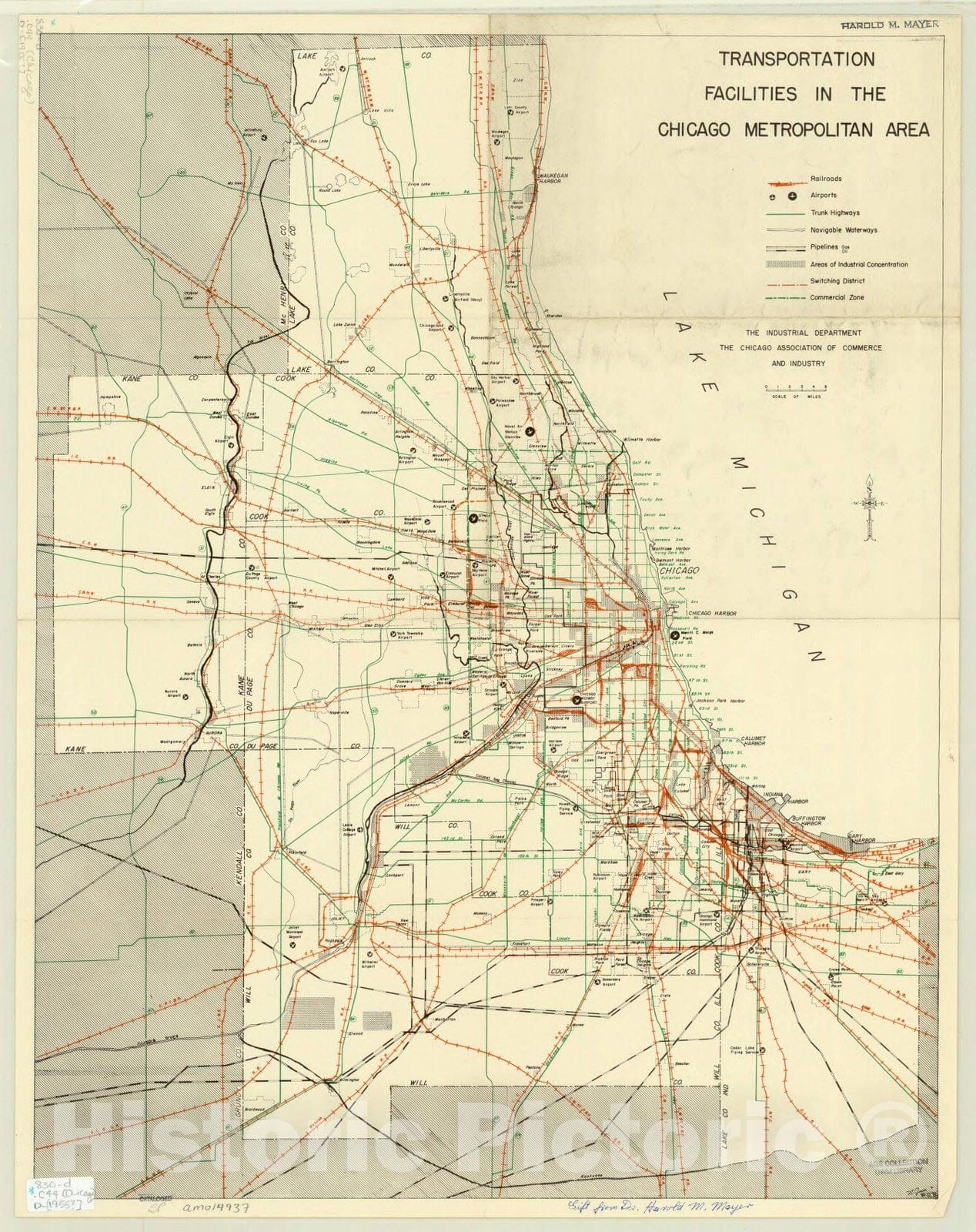 • .Map : Chicago, Illinois 1955, Transportation facilities in the Chicago metropolitan area , Antique Vintage Reproduction