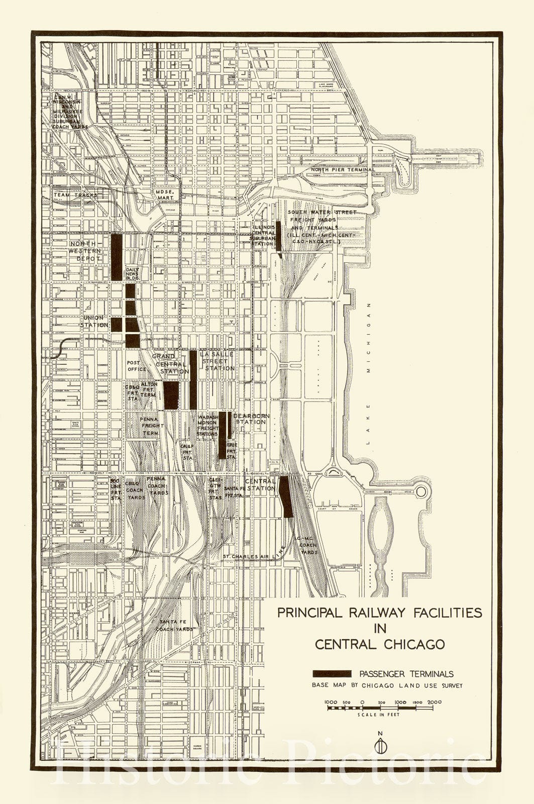 Map : Chicago, Illinois 1943, Principal railway facilities in central Chicago , Antique Vintage Reproduction