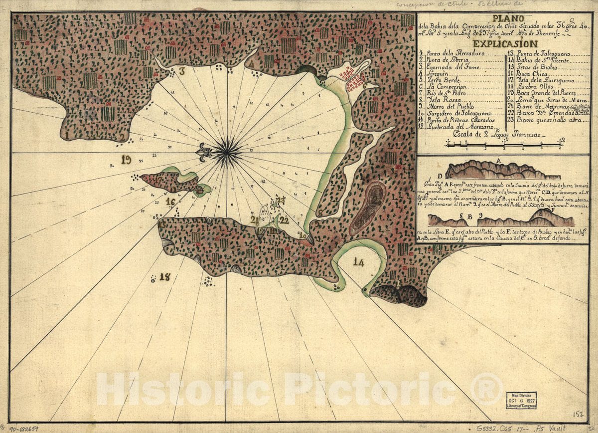 Historic 1700 Map - Plano de la BahÃa de la Compcessión de Chile situado en Los 36 gros. 40 ms. latd. S. y en la longd. de 297 gros. 40 ms. mro. de Thenerife.