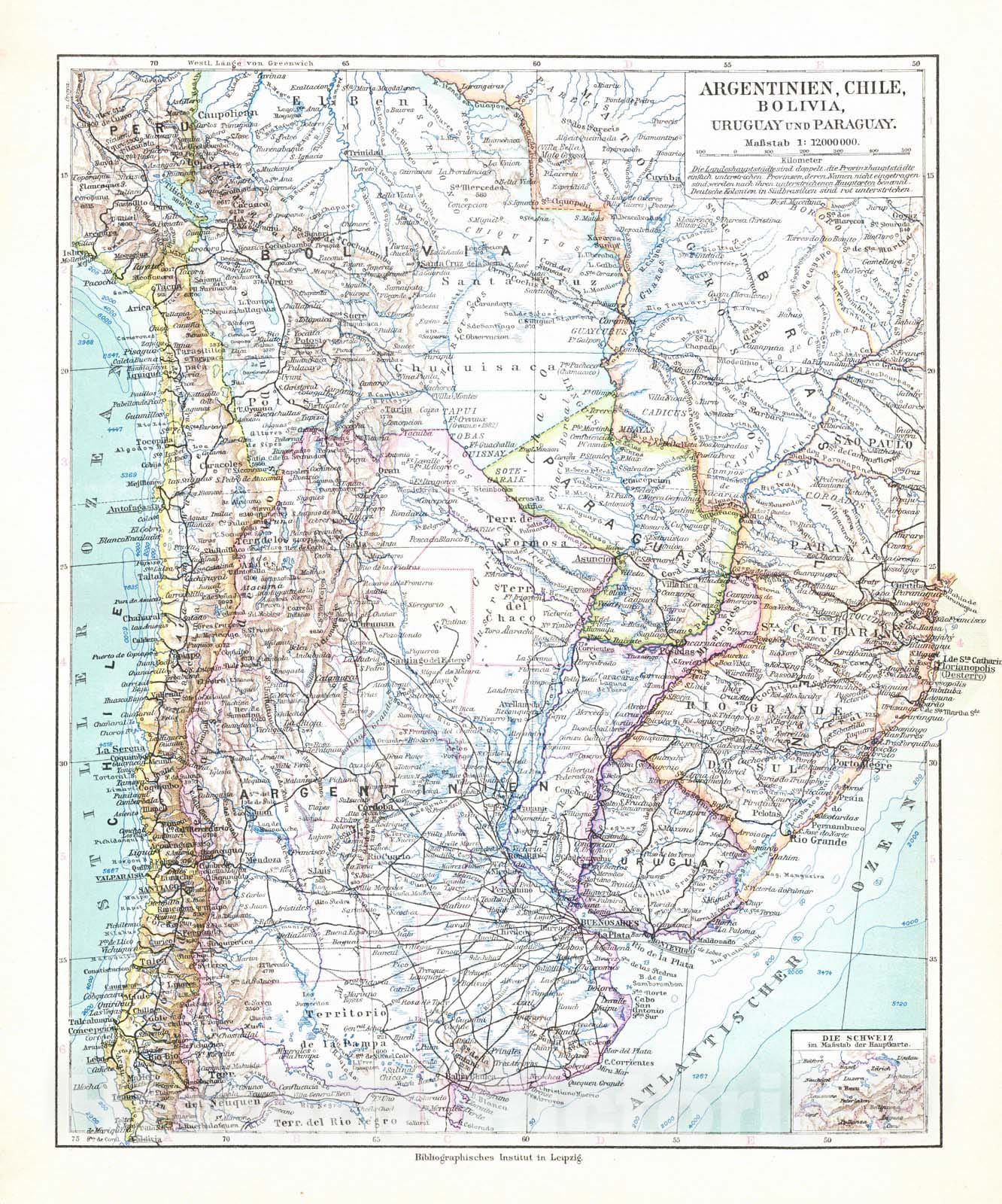 Vintage Map | 1924 Argentinien, Chile, Boliva, Urguagy und Paraguay | Bibliographisches Institut
