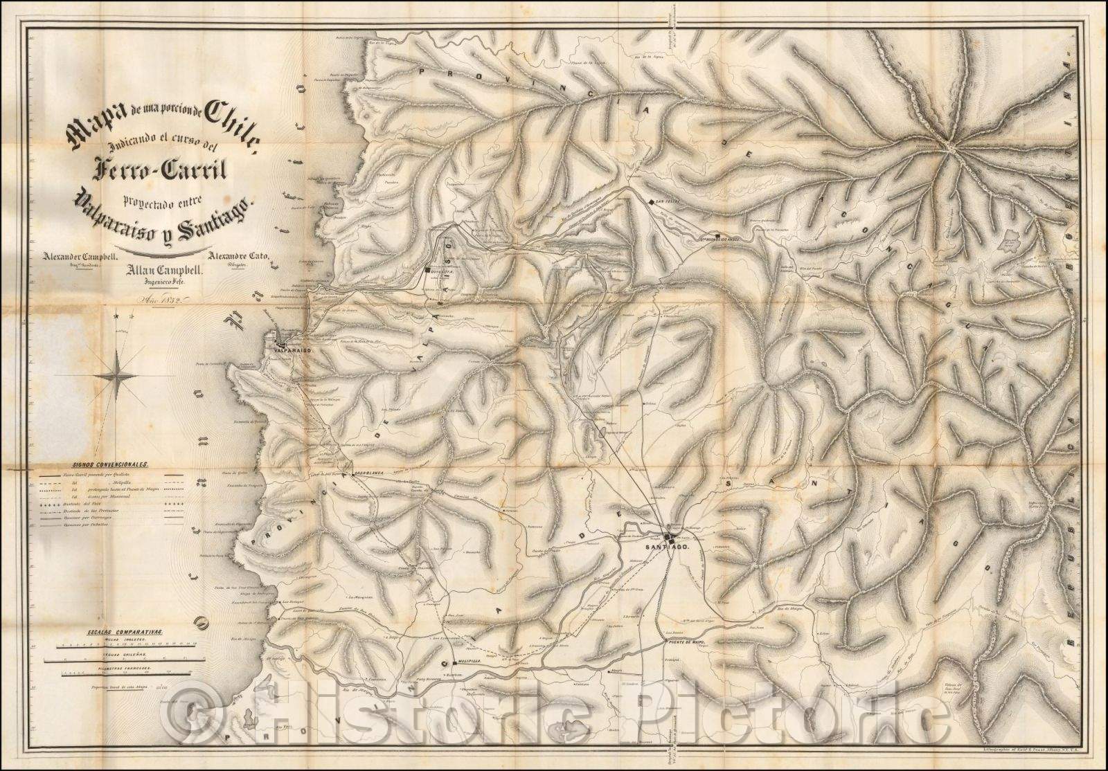 Historic Map - Mapa de una porcion de Chile, Indicando el curso del Ferro-Carril/Map of a portion of Chile, indicating the course of Ferro Carril, 1852 - Vintage Wall Art