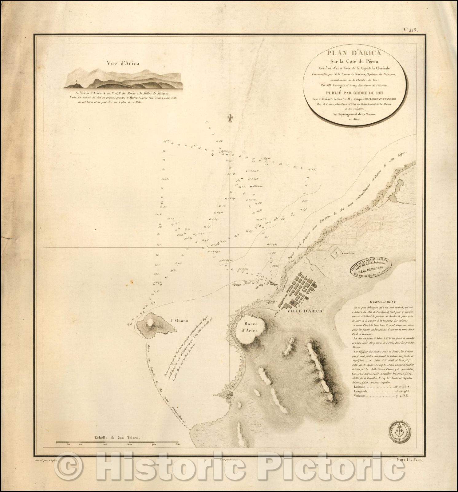 Historic Map - Plan D'Arica Sur la Cote du Perou Levee en 1822 a bord de la Frigate la Clorinde :: Sea Chart of the northern Chilean Coastline, town of Arica, 1824 - Vintage Wall Art