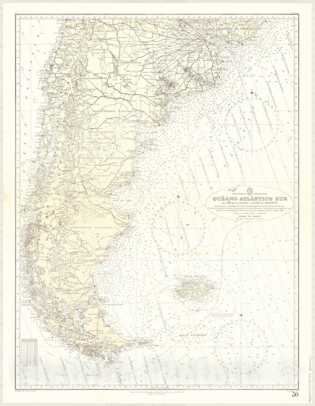 Republica Argentina, Oceano Atlantico Sur, de Rio de la Plata a Cabo de Hornos / compilacion de trabajos del Servicio de Hidrografia Naval de la Secretaria de Marina, Instituto Geografico Militar y Ministerio de Obras Publicas. Completada con datos de