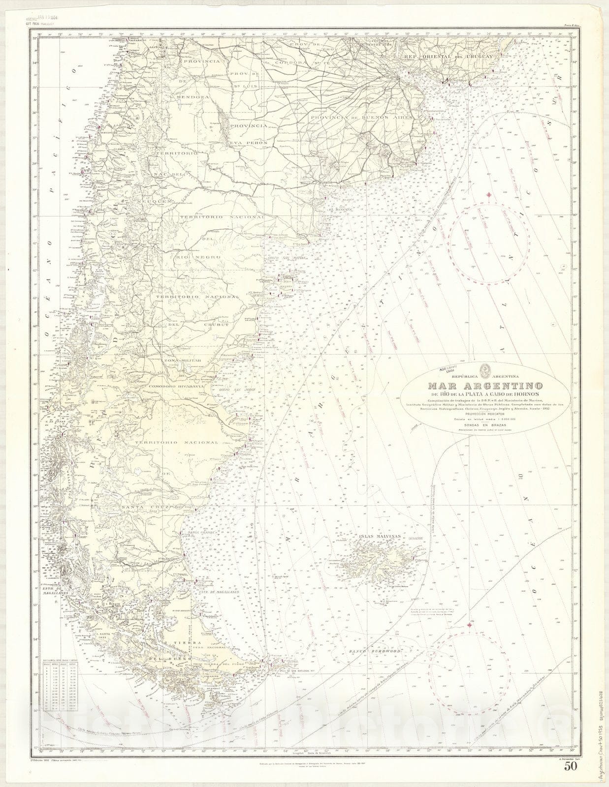 Map : Argentina and Chile coast 1953, Republica Argentina, Mar Argentino, de Rio de la Plata a Cabo de Hornos , Antique Vintage Reproduction