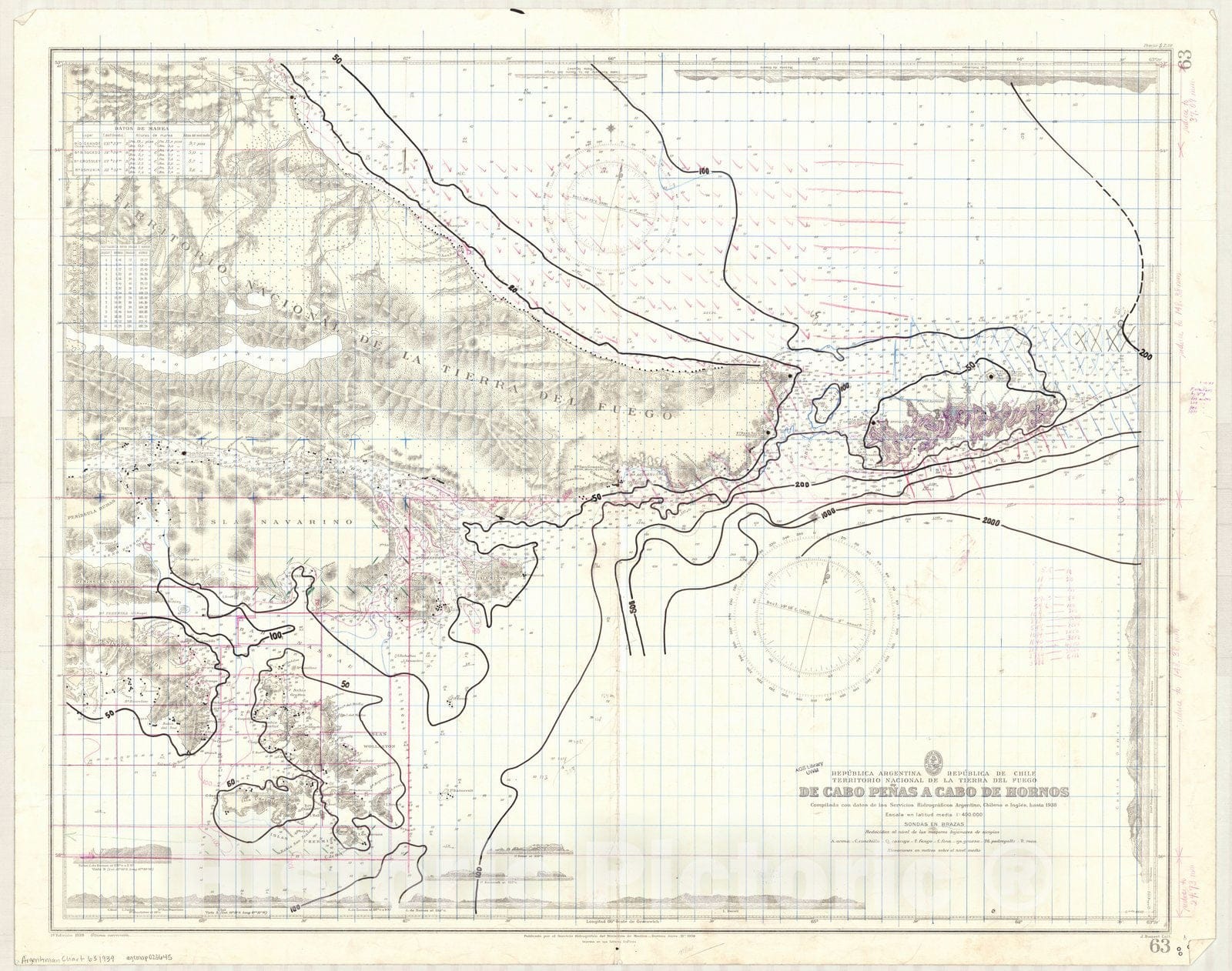 Republica Argentina, Republica de Chile, Territorio Nacional de la Tierra del Fuego, de Cabo Penas a Cabo de Hornos / compilada con datos de los Servicios Hidrograficos Argentino, Chileno e Ingles, hasta 1938 ; publicado por el Servicio de Hidrografico