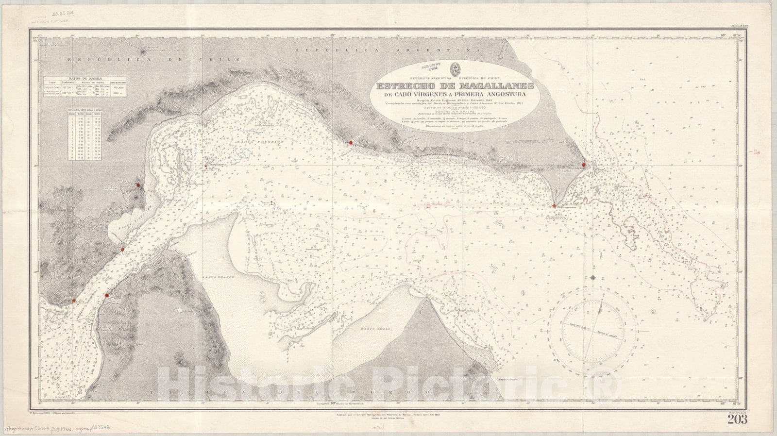 Map : Strait of Magellan 1933, Republica Argentina, Republica de Chile, Estrecho de Magallanes, de Cabo Virgenes a Primera Angostura , Antique Vintage Reproduction