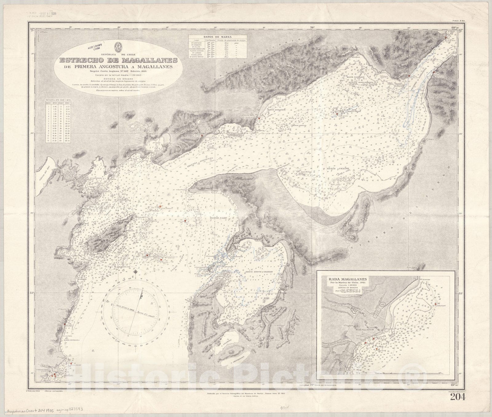 Map : Strait of Magellan 1935, Republica Argentina, Republica de Chile, Estrecho de Magallanes, de Cabo Virgenes a Primera Angostura , Antique Vintage Reproduction