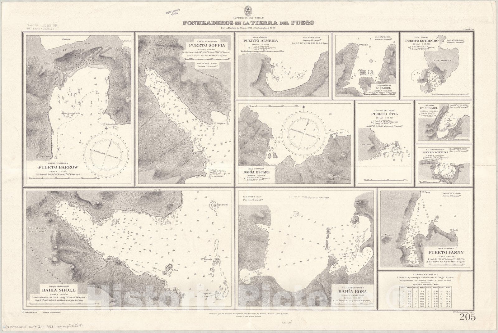 Map : Tierra del Fuego 1933, Republica de Chile, fondeaderos en la Tierra del Fuego , Antique Vintage Reproduction