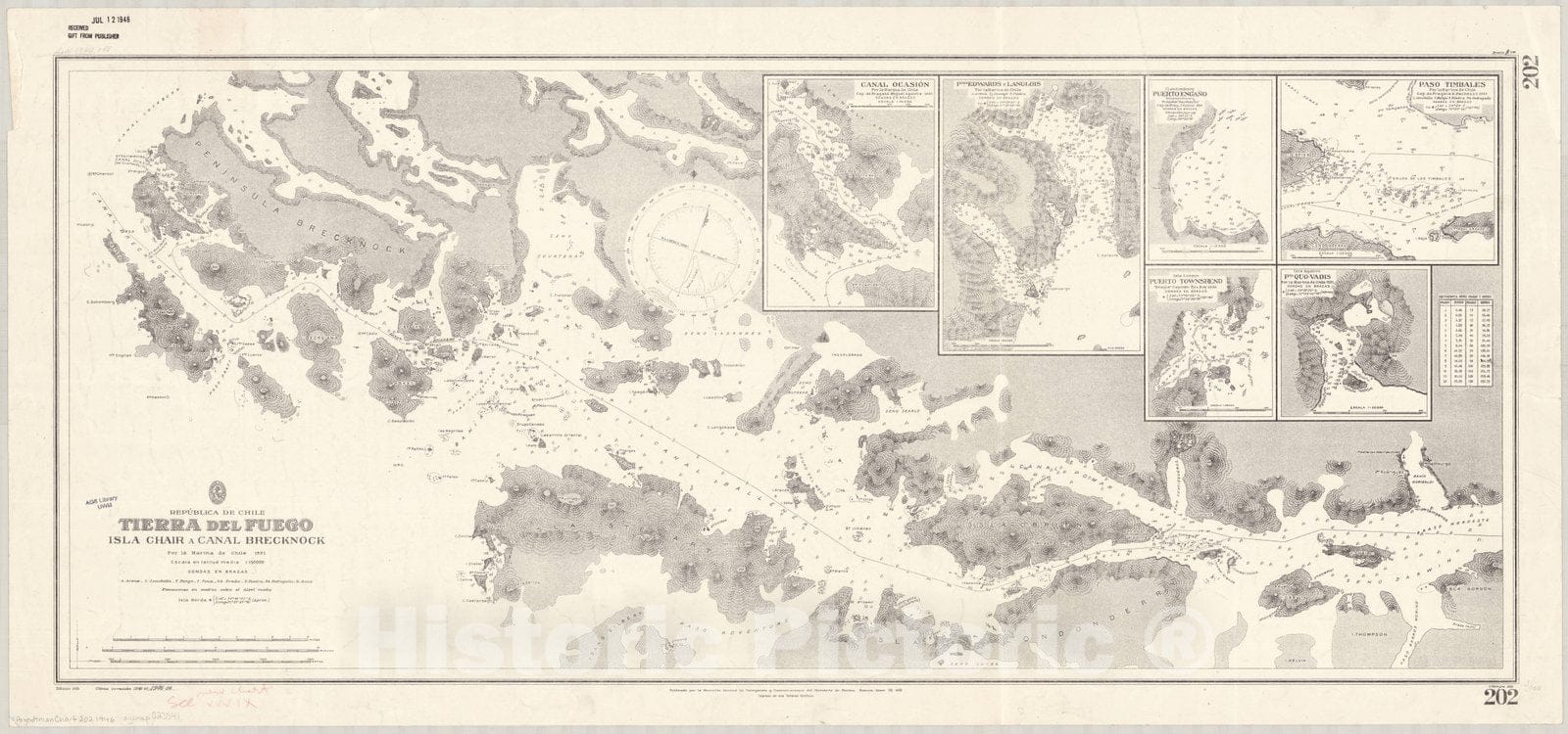 Map : Tierra del Fuego 1946, Republica de Chile, Tierra del Fuego, Isla Chair a Canal Brecknock , Antique Vintage Reproduction