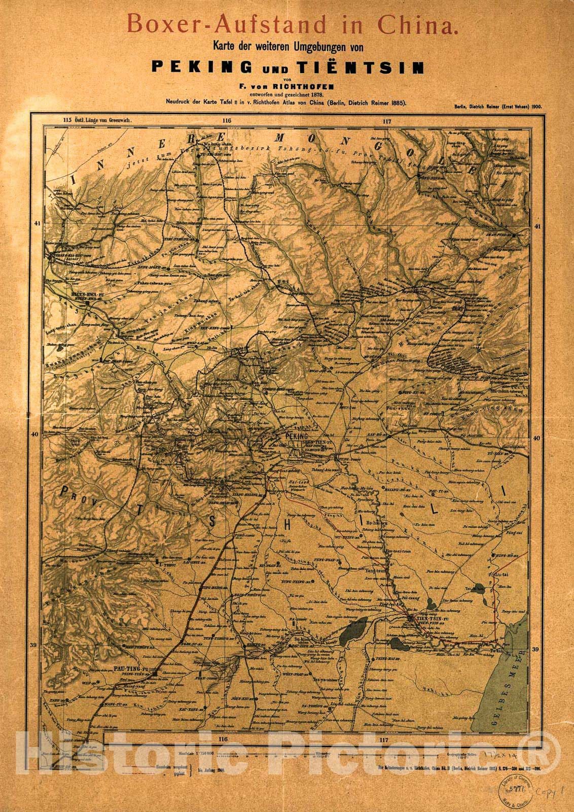 Historic 1900 Map - Boxer-Aufstand in China : Karte der weiteren Umgebungen von Peking und Tiëntsin