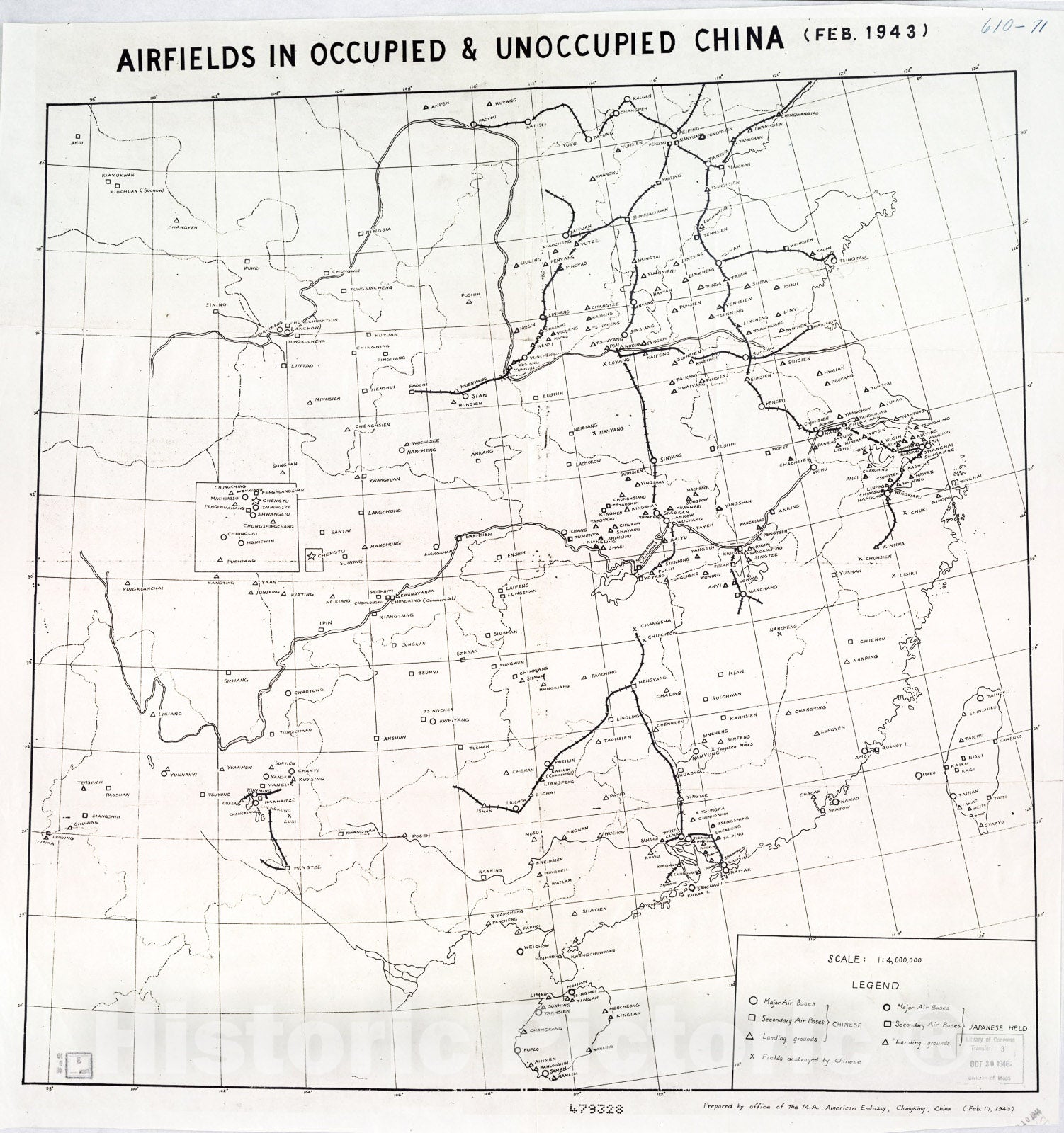 Historic 1943 Map - Airfields in Occupied & unoccupied China (Feb 1943)