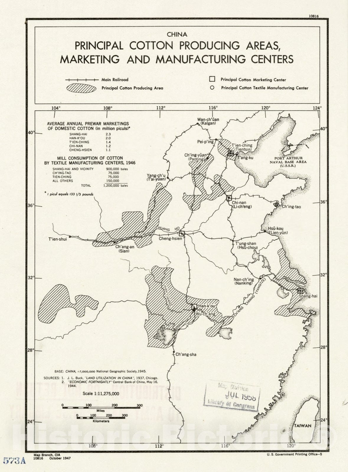 • .Historic 1947 Map - China, Principal Cotton producing Areas, Marketing and Manufacturing Centers