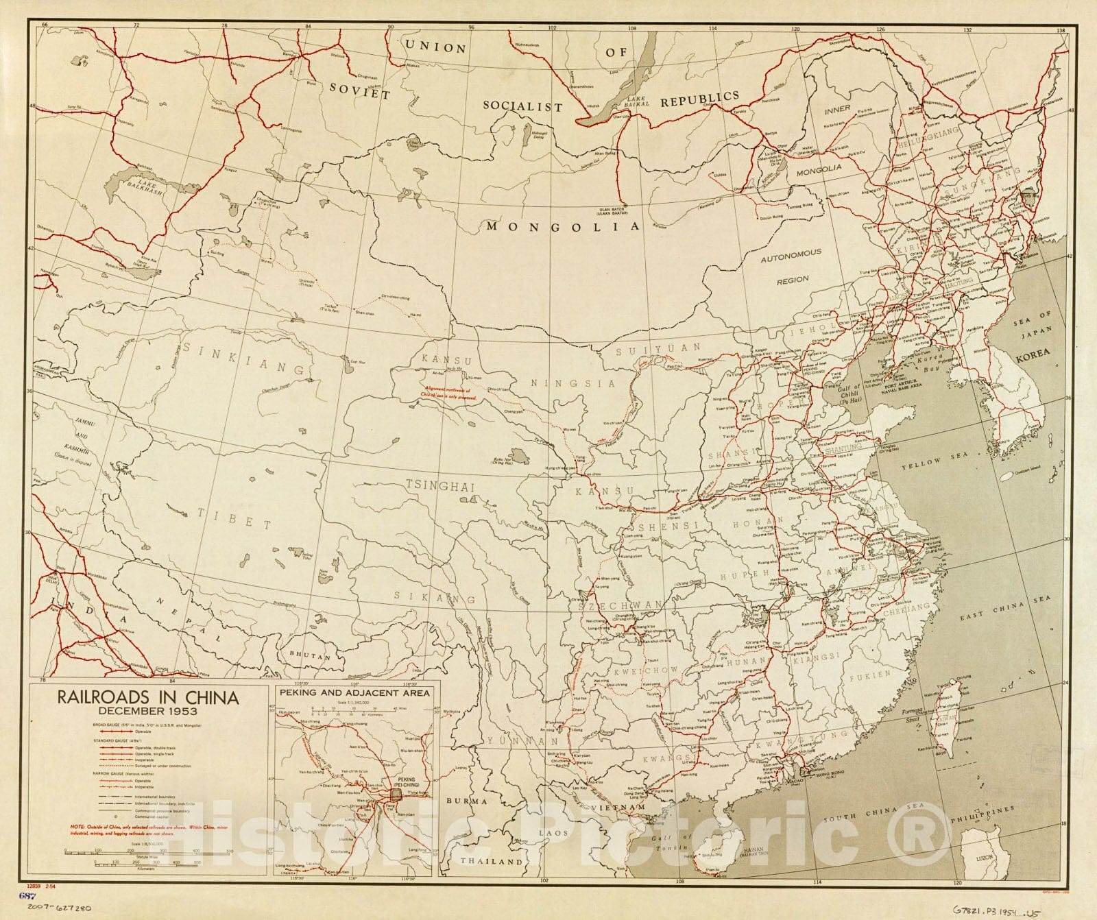 • .Historic 1954 Map - Railroads in China, December 1953.