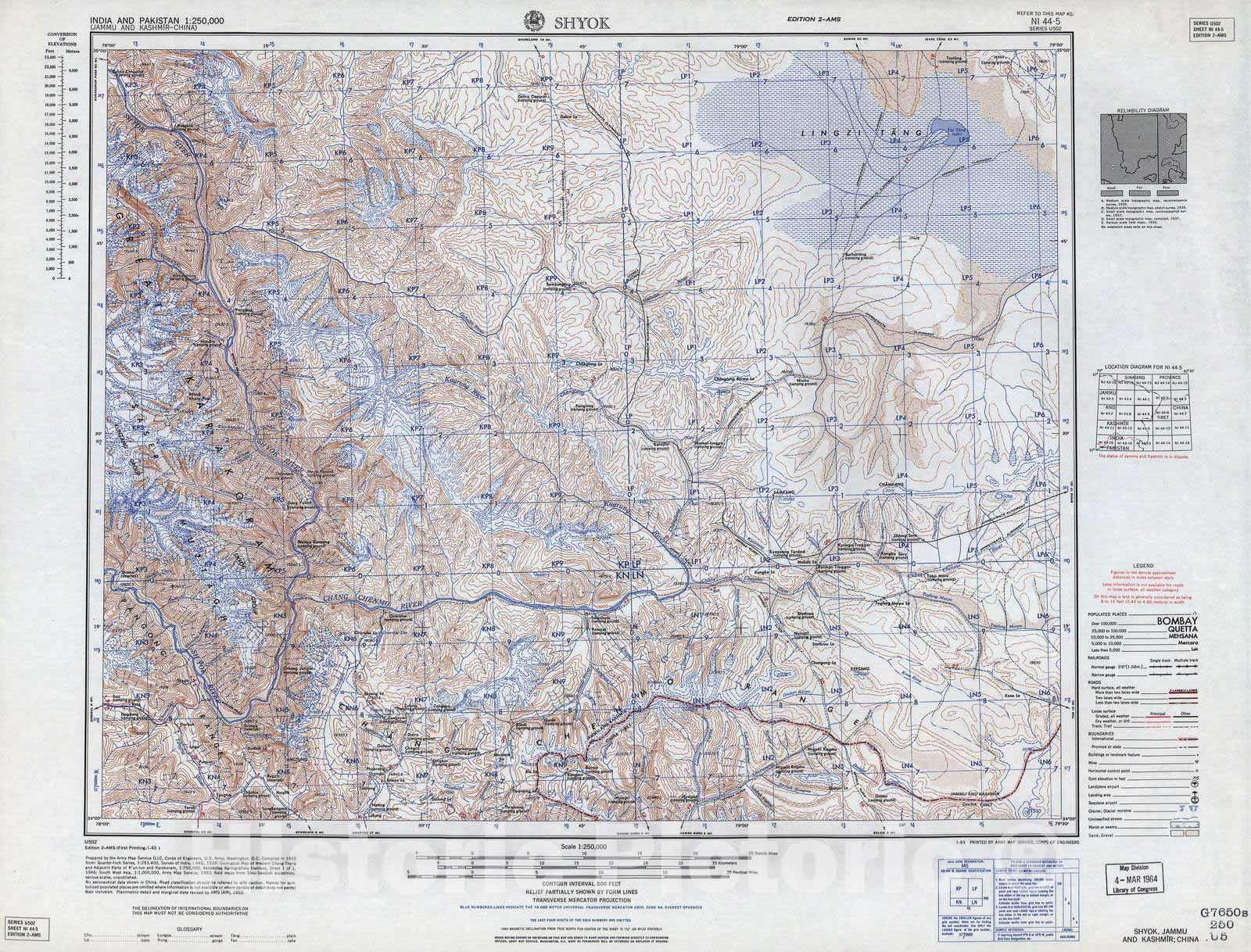 Historic 1955 Map - India and Pakistan 1:250,000. - Shyok, Jammu and Kashmir, China 1960