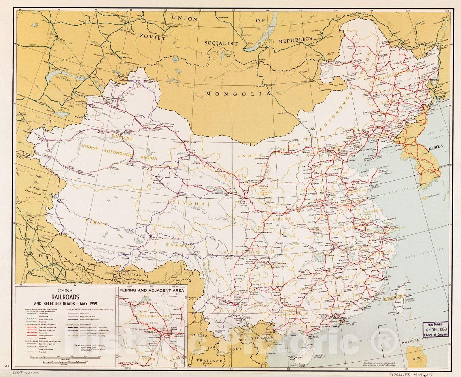 Historic 1959 Map - China Railroads and Selected Roads, May 1959.