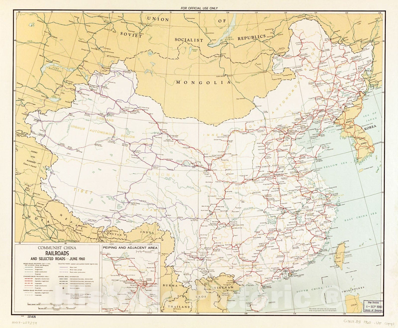 Historic 1960 Map - Communist China Railroads and Selected Roads, June 1960.