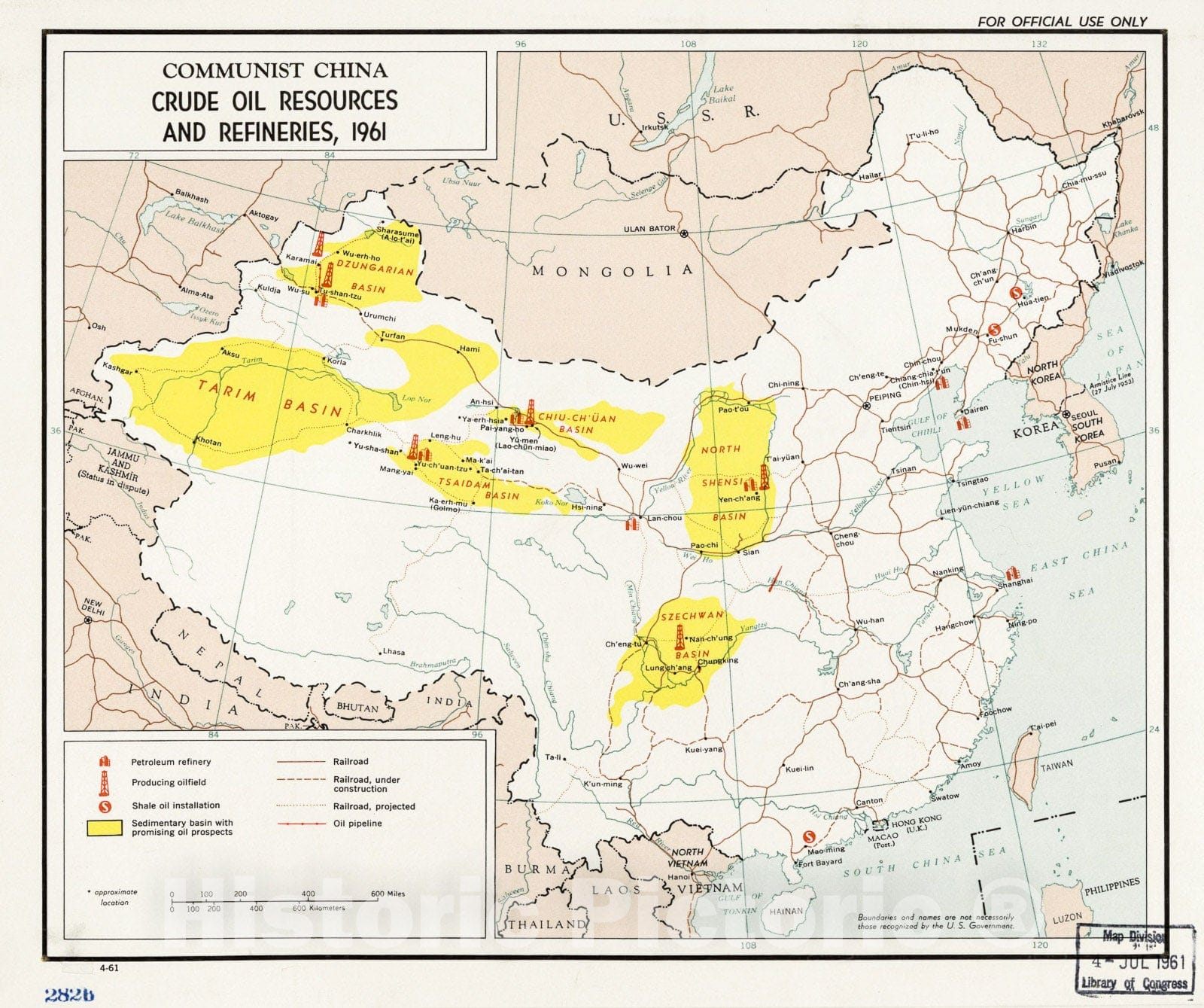 Historic 1961 Map - Communist China, Crude Oil Resources and Refineries.