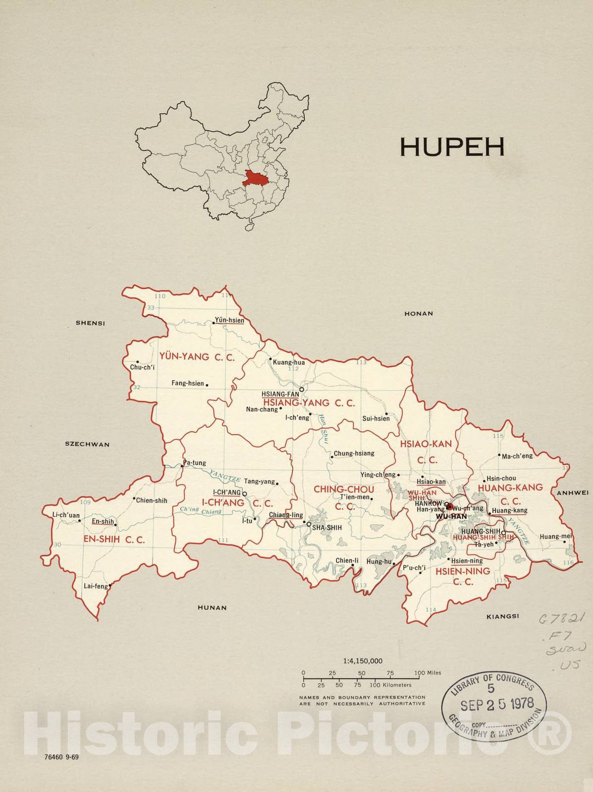 Historic 1969 Map - China, Administrative divisions. - Hupeh