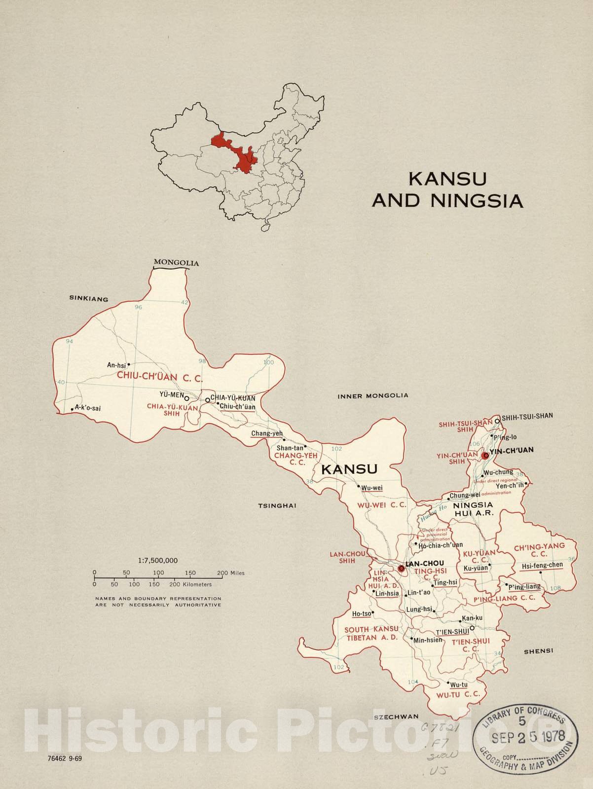 • Historic 1969 Map - China, Administrative divisions. - Kansu and Ningsia
