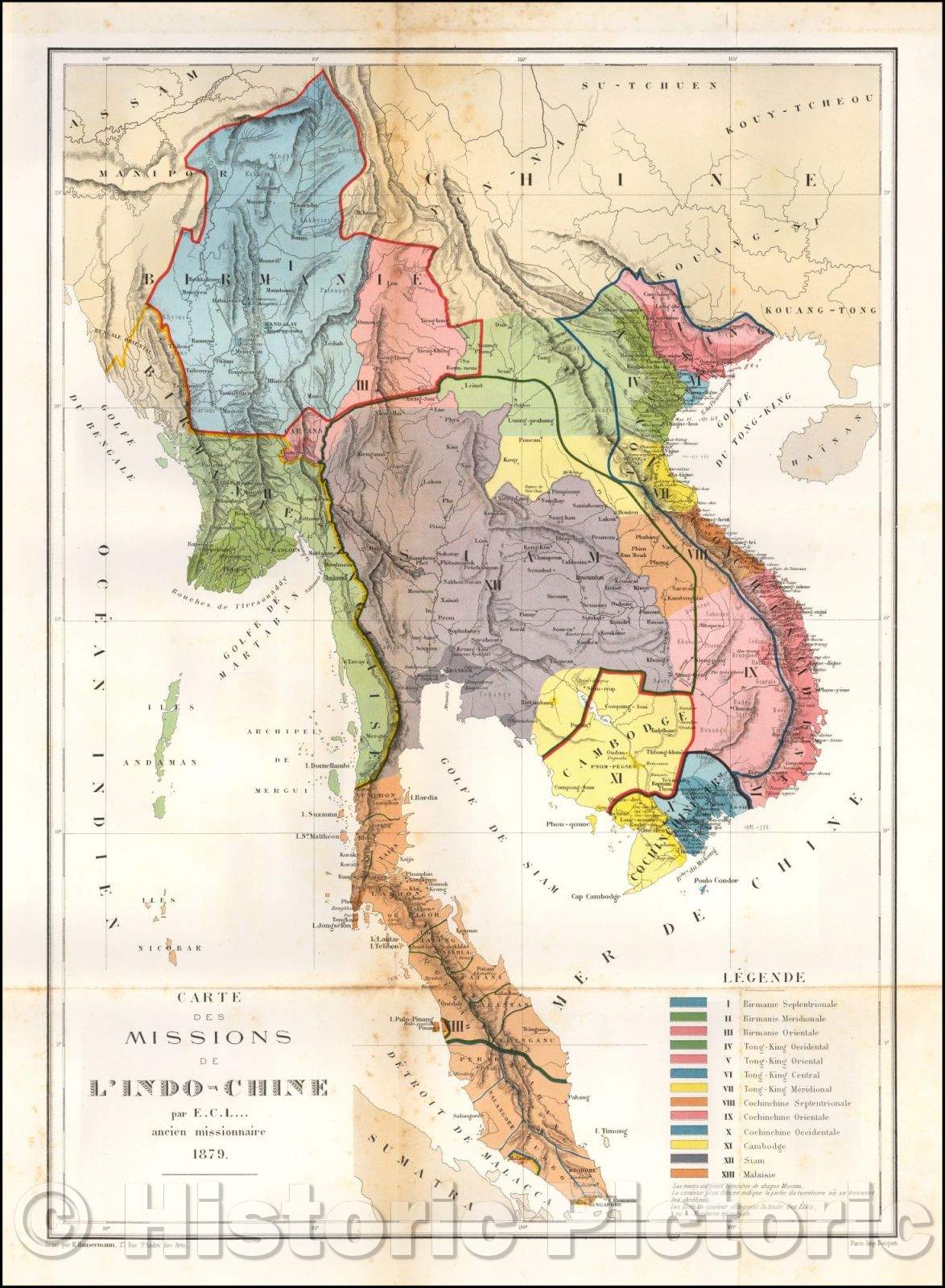 Historic Map - Carte des Missions De L'Indo-Chine par E.C. I. ancien missionnaire 1879/Map Mission Of Indo-China by E. C. I. former missionary in 1879, 1879 - Vintage Wall Art