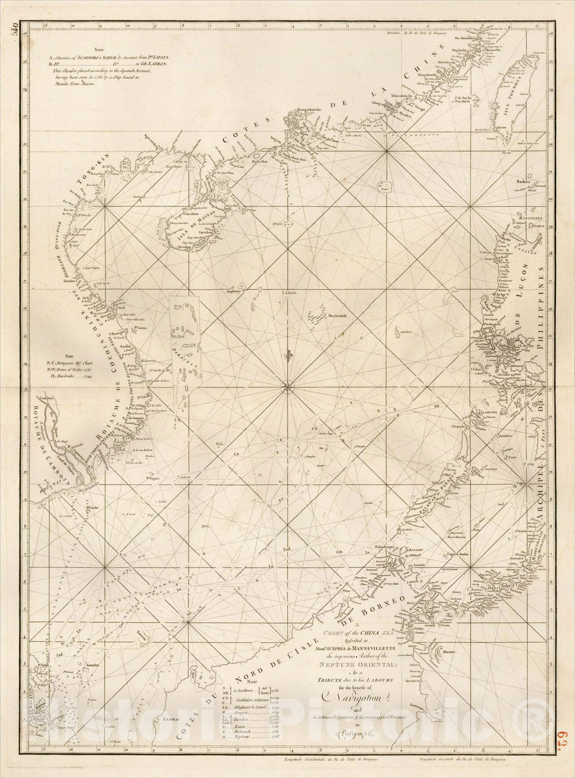 • .Historic Map : A Chart of the China Sea Inscribed to Monsr, 1770, Jean-Baptiste-Nicolas-Denis d'Apr? de Mannevillette, Vintage Wall Art