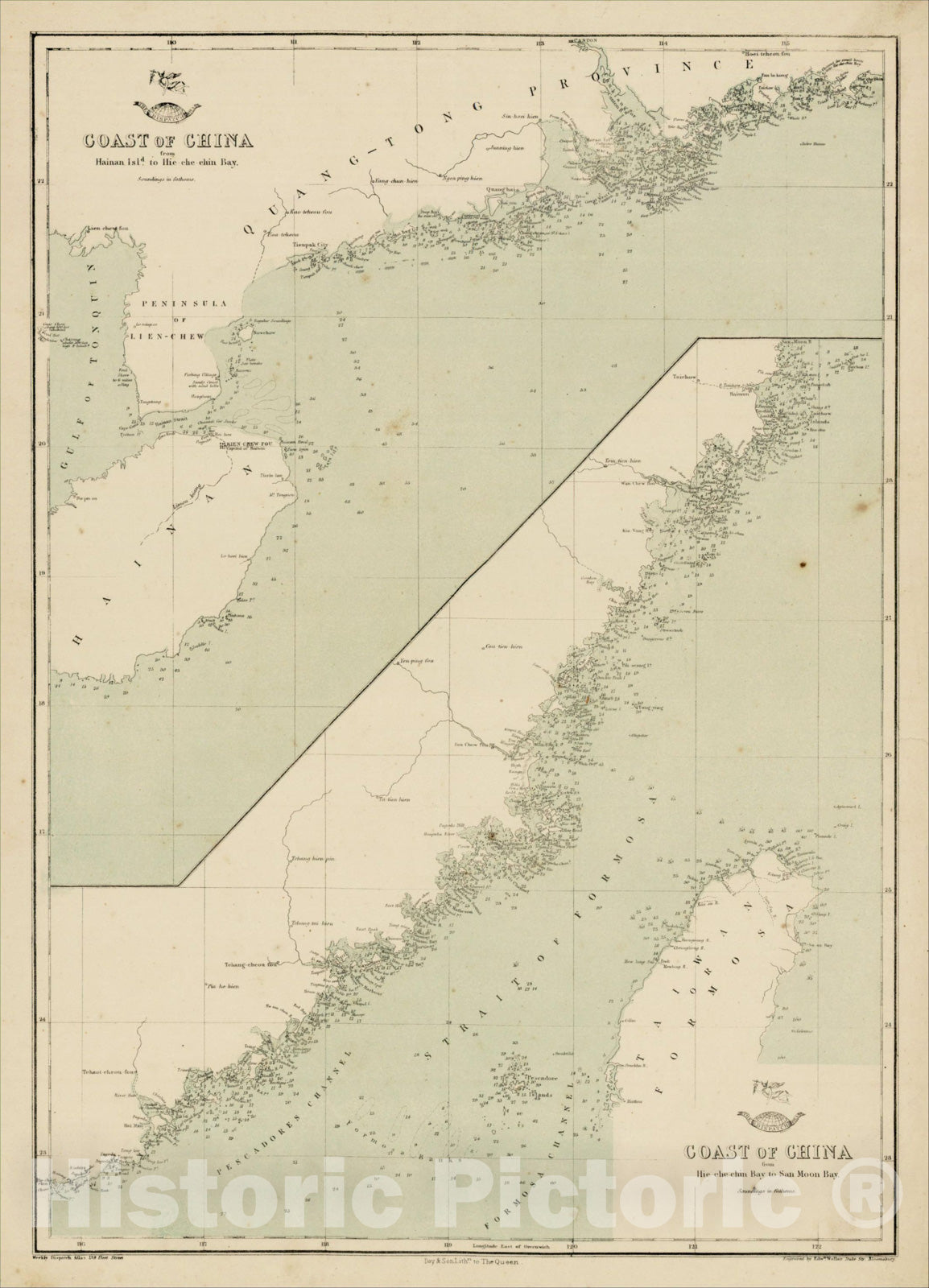 • .Historic Map : Coast of China from Hainan Isld. to Hie-che cin Bay (and) Hie che-chin Bay to San Moon Bay, c1860, Edward Weller, Vintage Wall Art
