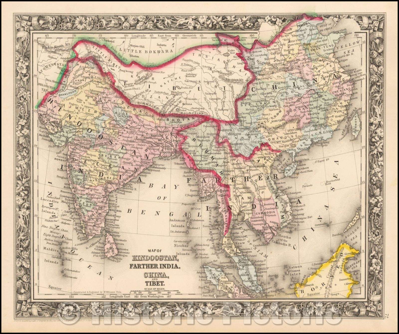 • .Historic Map - Map of Hindoostan, Farther India, China and Tibet, 1861, Samuel Augustus Mitchell Jr. - Vintage Wall Art