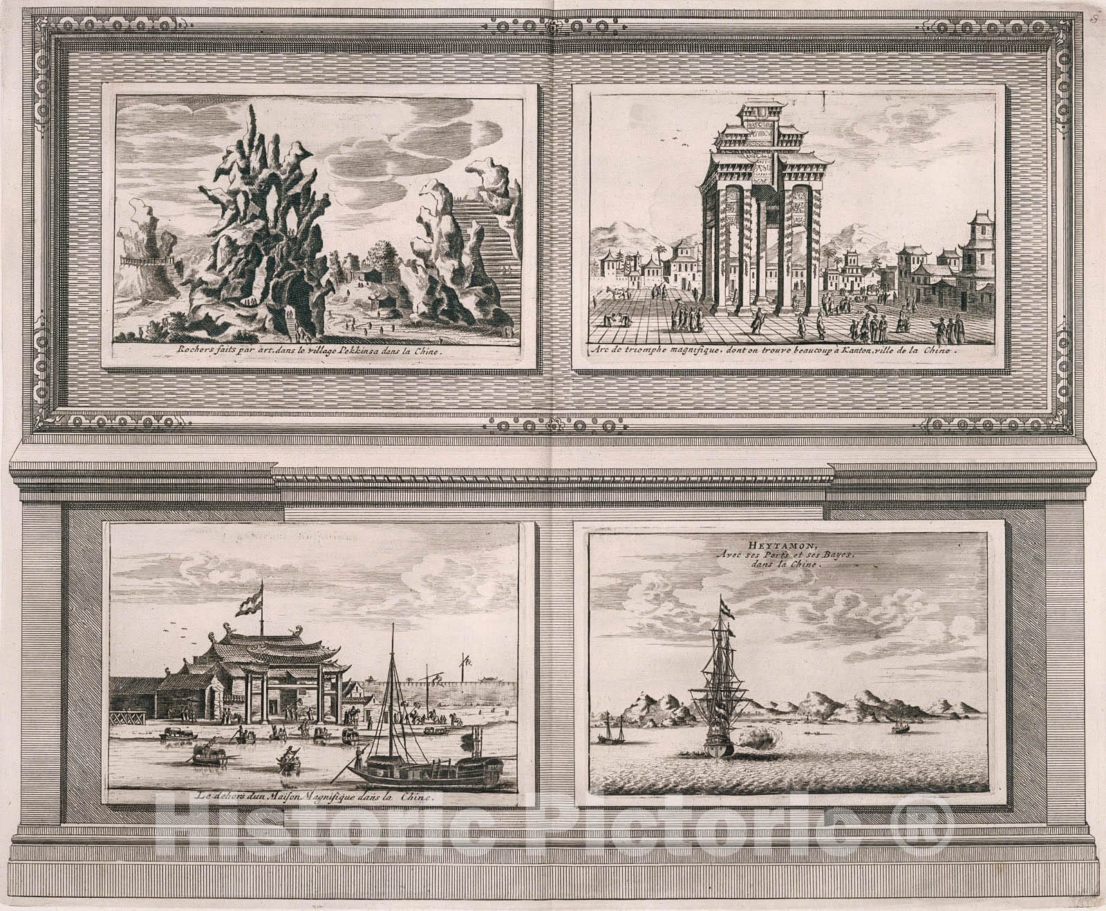 Historic Map : Rocks near Pekkinsa. b. Triumphal arch, Canton. c. a Magnificent House in China. d. Heytamon, 1728, Vintage Wall Decor
