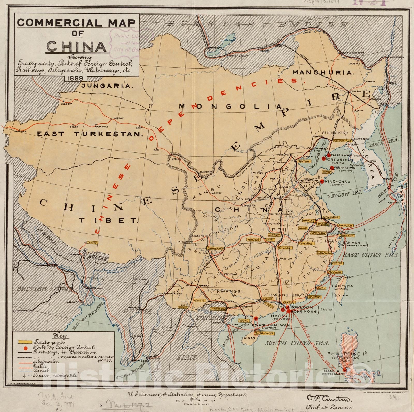 Historical Map, Commercial map of China : Showing Treaty Ports, Ports of Foreign Control, Railways, telegraphs, Waterways, etc, 1899, Vintage Wall Art