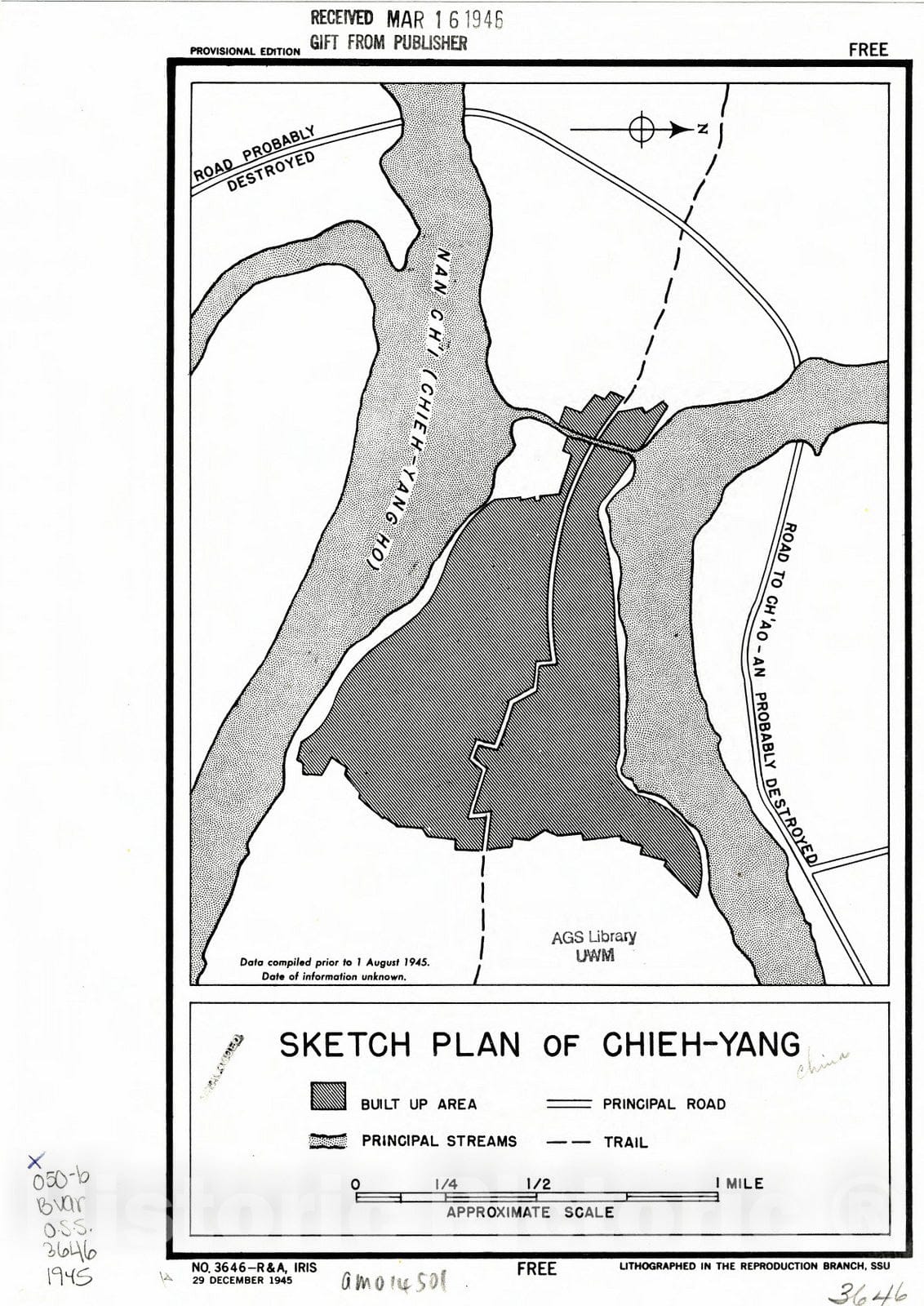 Map : Jieyang Shi, China 1945, Sketch plan of Chieh-yang , Antique Vintage Reproduction