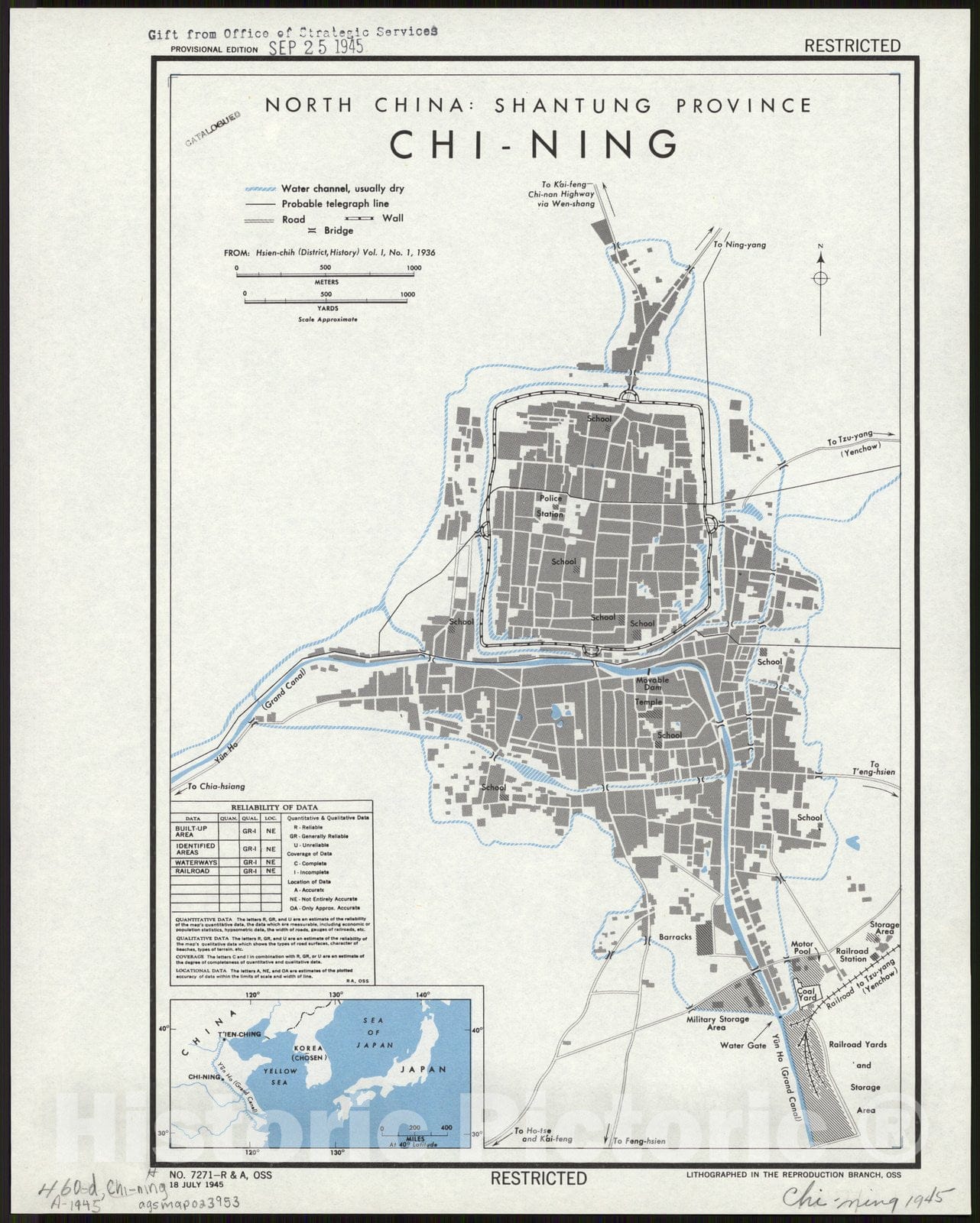 Map : Jining Shi, China 1945, North China, Shantung Province : Chi-ning , Antique Vintage Reproduction