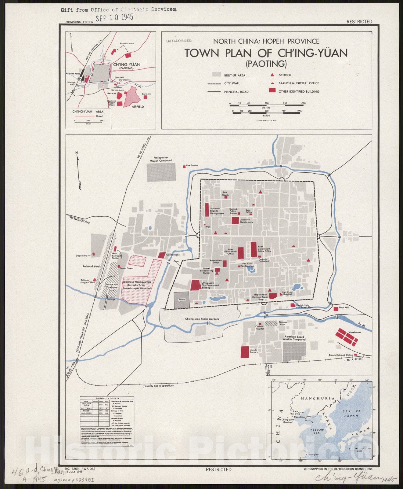 Map : Qingyuan Xian, China 1945, North China, Hopeh Province : town plan of Ch'ing-Yuan (Paoting) , Antique Vintage Reproduction