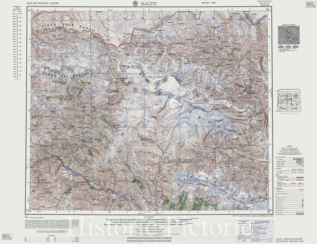 Historic 1955 Map - India and Pakistan 1:250,000. - Baltit, Jammu and Kashmir, Afghanistan, Pakistan, China 1958