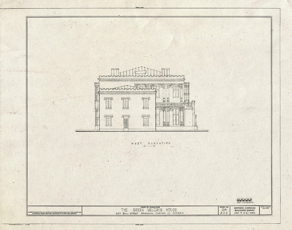 • Blueprint 7. West Elevation - Green-Meldrim House, 327 Bull Street, Savannah, Chatham County, GA