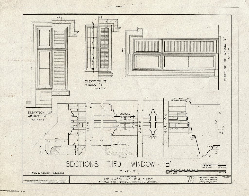 Blueprint 17. Window B Sections; Windows A, B, and C elevations - Green-Meldrim House, 327 Bull Street, Savannah, Chatham County, GA