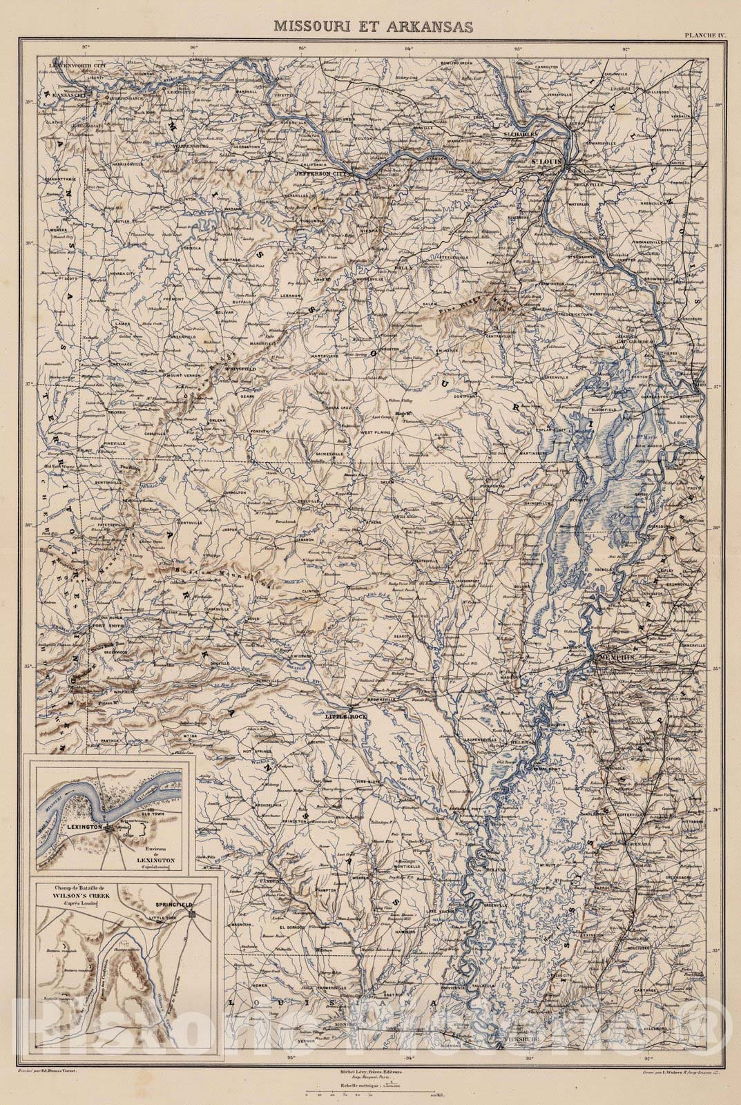 Historic Map : Arkansas, 1874 Planche IV. Missouri et Arkansas. Environs de Lexington. Champ de Bataille de Wilson's Creek. , Vintage Wall Art